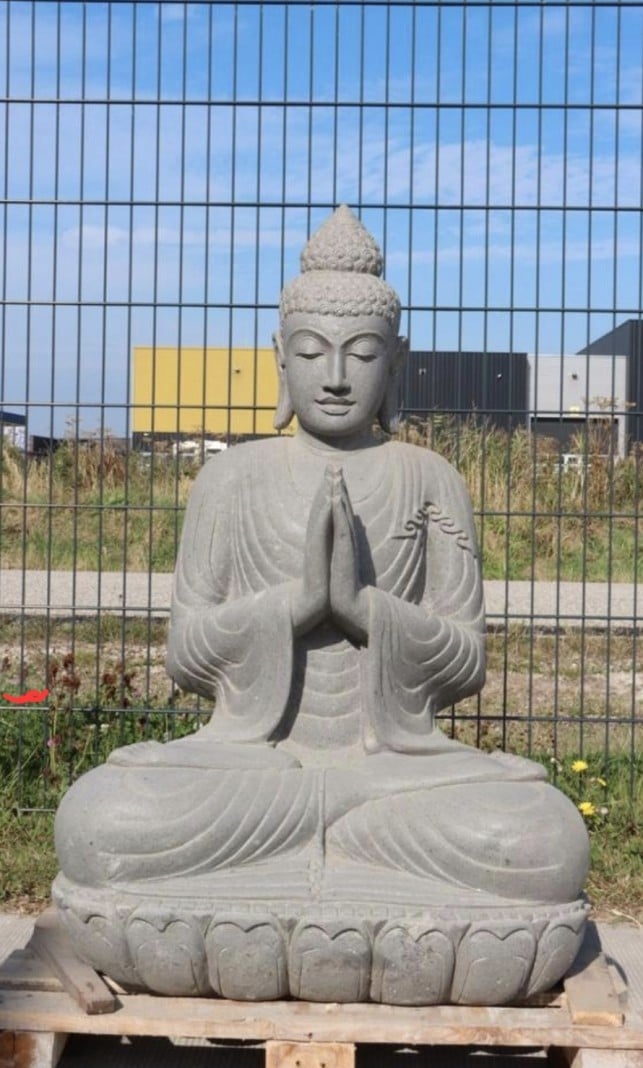 Statue de Bouddha de jardin apaisante Namaste Mudra faite à la main à partir de pierre de lave 100 cm